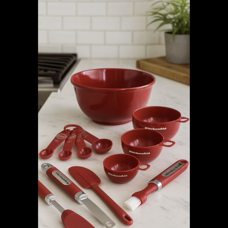 - Complete 5-piece set – Includes measuring cups, spoons, whisk, spatula, and pastry brush.