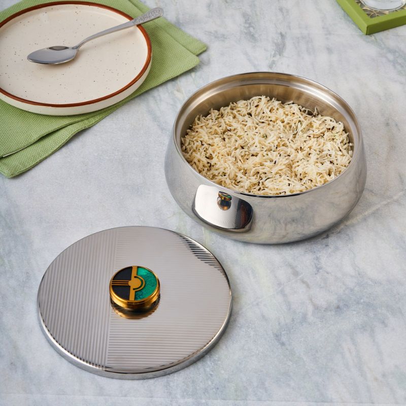 Designed for both style and performance, this generously sized bowl is built with a double-walled interior that helps maintain the temperature of food for longer. As a result, it is ideal for serving hot curries, rice, biryanis, or chilled dishes during everyday meals and special occasions. Moreover, its polished finish and balanced proportions make it suitable for formal dining as well as festive entertaining.