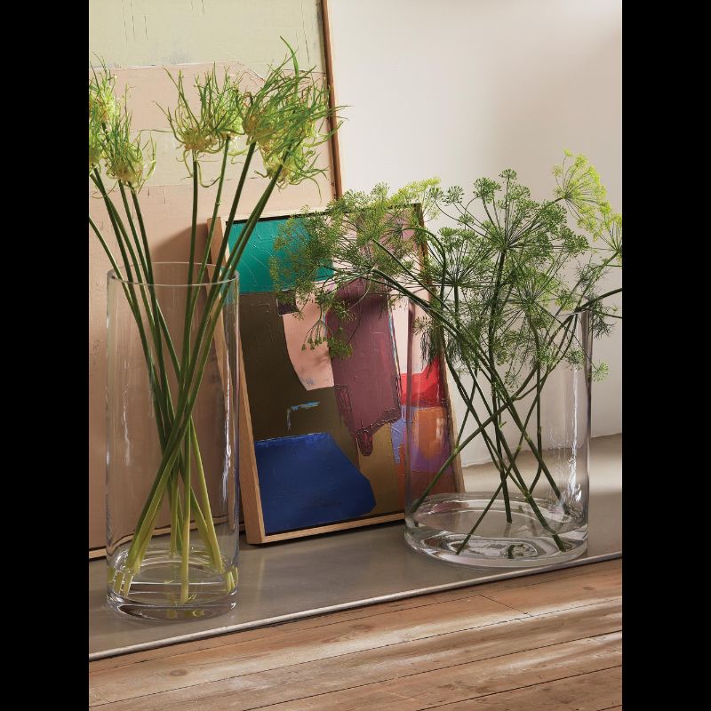 Standing 40 cm tall with a 30 cm diameter, this mouth-blown glass piece adds elegance to both contemporary and classic interiors. Its transparent clarity complements floral displays and candlelight equally well, creating a warm, inviting atmosphere. Handwash recommended for long-lasting brilliance.
