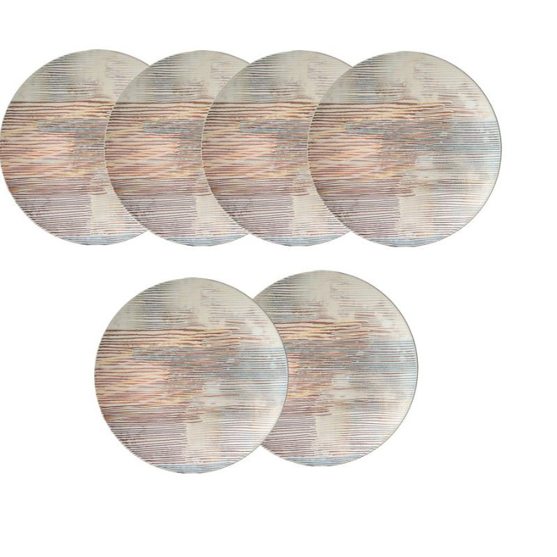 Add a touch of rustic elegance to your dining table with the MESA Rio Gold Half Plate Set. Each handcrafted stoneware plate is designed with fine horizontal stripes in warm earth tones – terracotta, yellow ochre, and subtle blue accents – evoking natural artistry and timeless charm. The slightly textured, off-white base enhances its handcrafted appeal, making it perfect for everyday meals or special occasions alike.