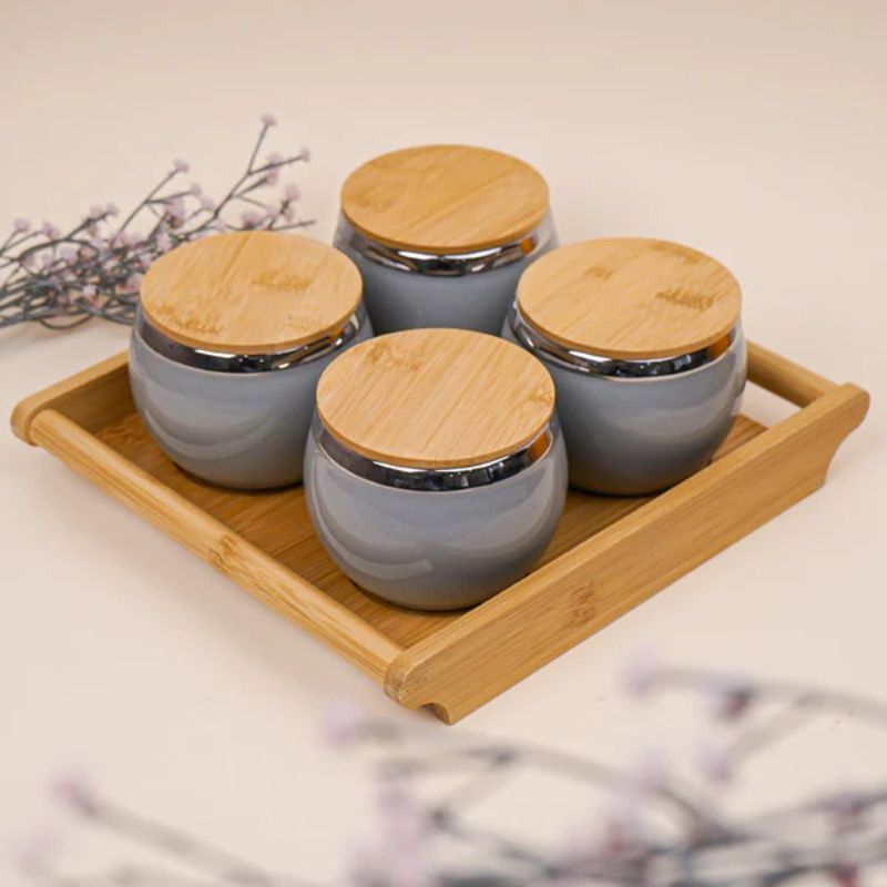 Tachiso | Lira Grey Dry Fruit Jar with Tray | Ceramic | Grey | 360 ML Each | Set of 5