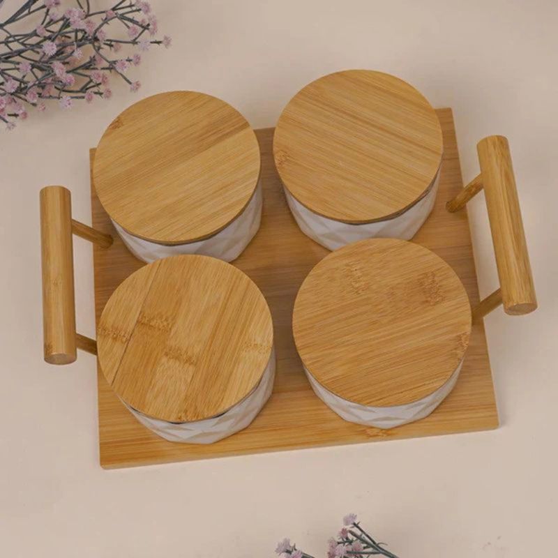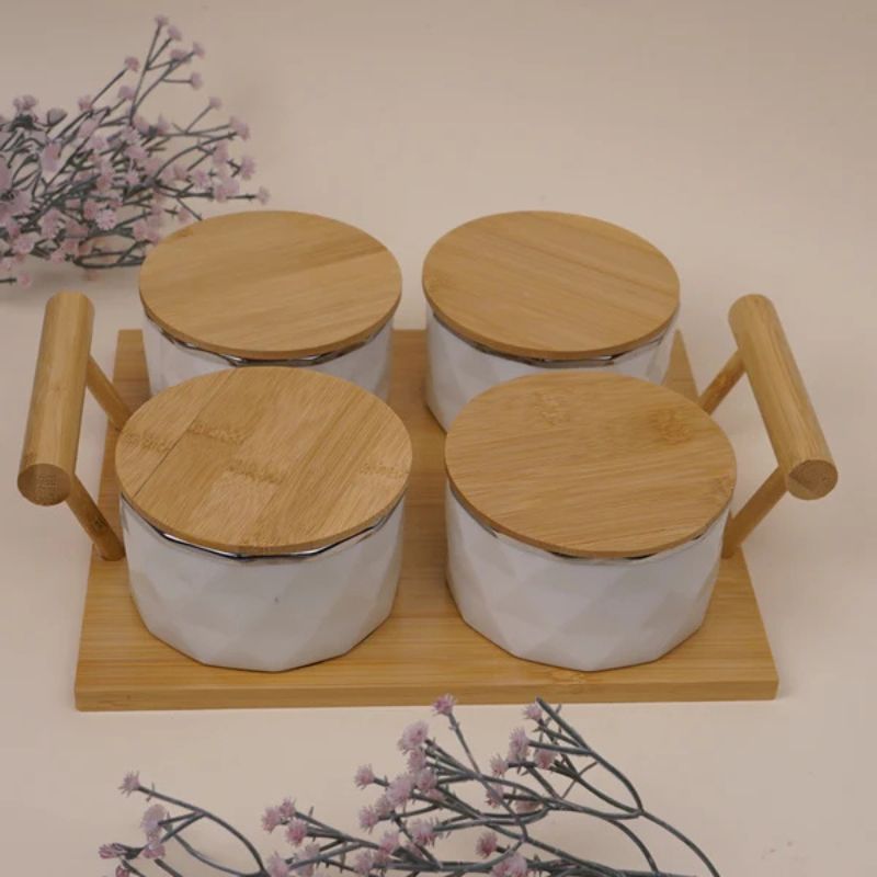 Each jar has a 300 ML capacity, making it perfect for everyday use. Additionally, the included tray keeps all four jars neatly organized, saving space on your countertop or dining table. Because of its sleek white finish, this set complements both minimalist and festive décor.