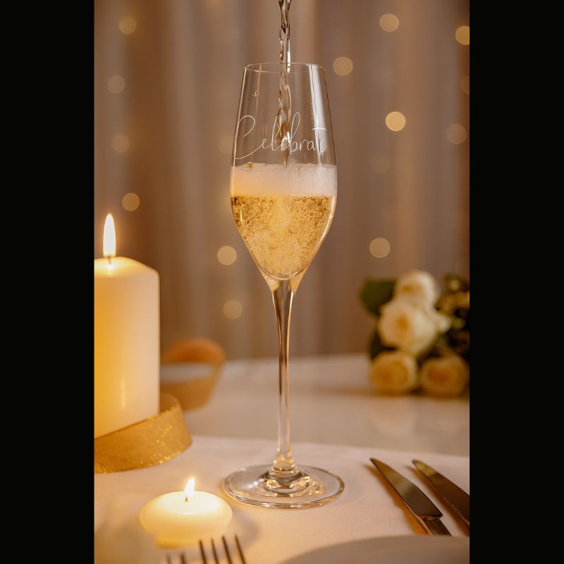 Raise a toast in style with the Diamante Swarovski Champagne Flute with “Celebrate” Slogan, a stunning crystal glass designed to mark life’s most memorable occasions. Handcrafted from ultra-clear, lead-free blown crystal, this single champagne flute features a real platinum-etched “Celebrate” slogan, making it a timeless keepsake for weddings, anniversaries, birthdays, or festive gatherings.