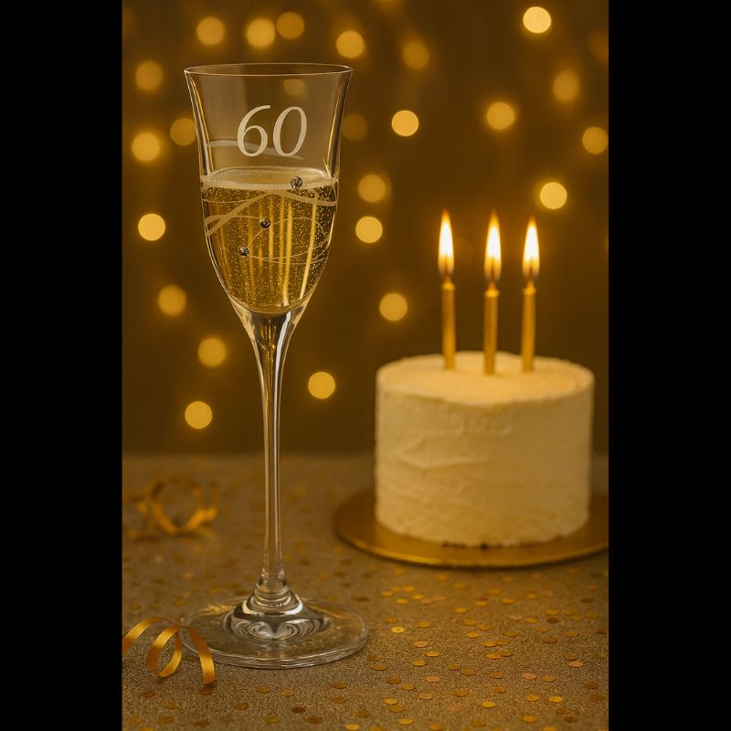 Celebrate a milestone in style with the Diamante Swarovski Wine Glass with “60” Etched, a timeless piece designed to honour life’s most special occasions. This exquisite crystal wine glass is hand-etched with the number 60, making it the perfect keepsake for a 60th birthday or anniversary. The elegant spiral hand-cut design wraps gracefully around the bowl and is enhanced with three genuine Swarovski crystals, adding subtle sparkle and sophistication.