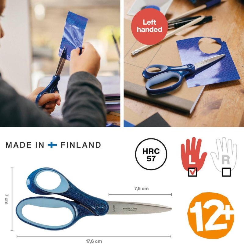 Perfect for school, arts, and crafts, the Fiskars Glitter Blue Left-Handed Scissors blend functionality, safety, and fun design — ideal for every creative classroom or home workspace.