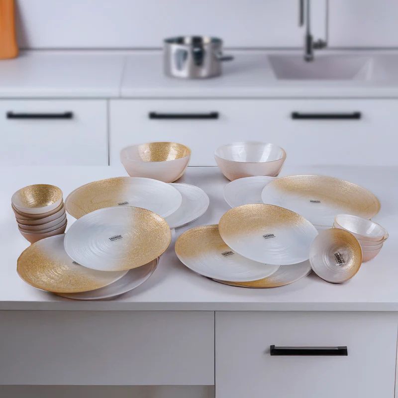 Elevate your dining experience with the Tachiso Wiero Dinner Set in Gold Glass. Designed to bring elegance and charm to your table, this 26-piece set blends everyday functionality with luxurious appeal. Whether it's a daily meal or a festive celebration, the Wiero set adds sophistication to every occasion.