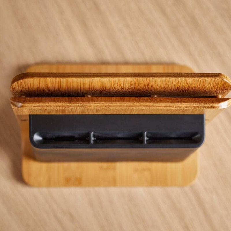 Crafted from FSC-certified bamboo and durable plastic, this knife block offers a sustainable yet sturdy storage solution for modern kitchens.