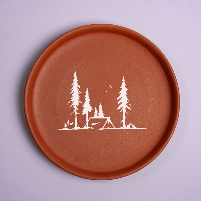 One plate depicts a serene campsite, ideal for nature lovers. -
