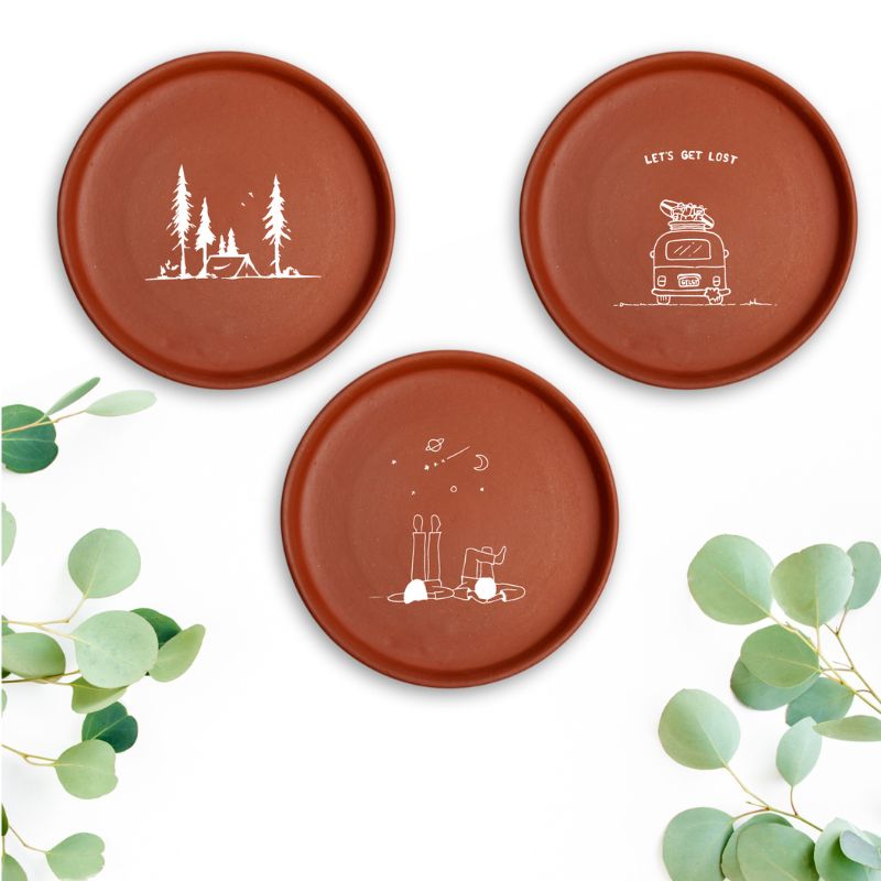Includes three handcrafted terracotta wall plates, each inspired by travel and exploration. -